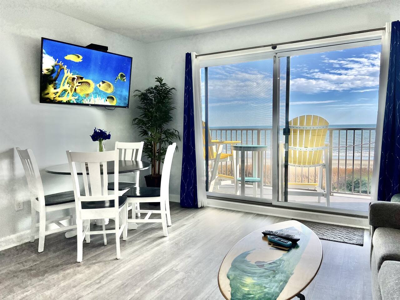 🏝️ Welcome to our stunning oceanfront condo in Myrtle Beach, South Carolina! Enjoy breathtaking views of the Atlantic Ocean from your private balcony, just a 300 foot walk to the beach, and six miles south of the Grand Strand and boardwalk. Our 1-bedroom, 1-bath condo offers a comfortable and rejuvenating stay for your vacation.✨ Ask us about seasonal rates and monthly rentals! ✅ Direct oceanfront location with panoramic views of the ocean and pond ✅ 1 bed/1 bath condo with 550 square feet of space ✅ Set of bunk beds in the foyer for added privacy and separate sleeping space ✅ Pull-out sofa for extra sleeping arrangements ✅ Balcony opening up to the ocean with beautiful views of the pond and Atlantic! Resort Amenities: - Basketball court, tennis courts, and Pickleball courts - Indoor and outdoor pools - Saunas and steam rooms - Hot tubs - Lazy river w/tubes and kiddie pool - Kids splash area and playground - Outdoor showers - Outdoor grilling stations and dining tables - Sundecks w/loungers - Beachfront bar and grill with nightly entertainment - Ladder golf, cornhole, and horseshoes - Outdoor chess/checker board - Giant Jenga - Putting green Kitchen Amenities: - Cooking essentials - Full-size kitchen with a ninja blender for icy blended drinks - Drip coffee maker - Fridge with ice maker - Full-size stove and oven - Toaster - Dishwasher - Garbage disposal Bathroom Amenities: - Hair dryer - Bathtub - Removable shower head - Hand soap provided - Body soap and shampoo Bedroom Amenities: - Iron and ironing board - Luggage rack - Closet with hangers - Full-length mirrors - Room darkening shades - Dresser - Roku TV Living Room Amenities: - Dining table with four chairs - 50” Roku tv for streaming - Full pull out sofa sleeper - Board games - Room darkening curtains Safety Features: - First aid kit - Fire extinguisher - Smoke detectors - Beach lifeguards - On-site security - Gated resort Additional Amenities: - WiFi - Desk area - Keyless entry for easy check-in and check-out Close to: - Airport - Grand Strand Boardwalk and Promenade - Murrells Inlet Marshwalk - Broadway at the Beach - Myrtle Beach State Park - Fun Wharehouse - Beach Stores - Walmart Market - 810 billiards and bowling - Market Commons - Ice cream & candy stores - Miniture Golfing - Golf courses - Wonderful dining options We recommend renting a vehicle if you’d like to indulge in the Myrtle Beach Activities, but Uber is reliable and efficient if that is your preference. Come and experience the best of Myrtle Beach with our oceanfront condo rental. Book now and indulge in a memorable beach getaway filled with relaxation, fun, and breathtaking views